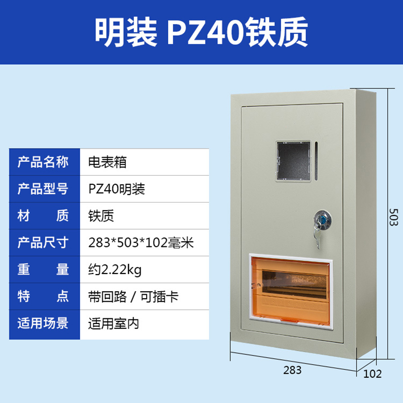我公司生產的PZ40電表箱采用0.5-1mm厚冷軋鋼板和進口PC高透視窗,并帶有門鎖,安全防盜,大氣美觀??砂惭b各類電能表和C45、空氣開關、斷路器閘刀等,廣泛用于家庭、公寓、學校、工廠等場所。